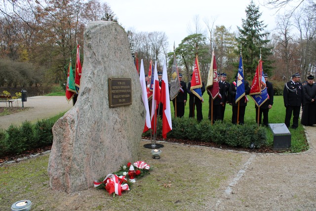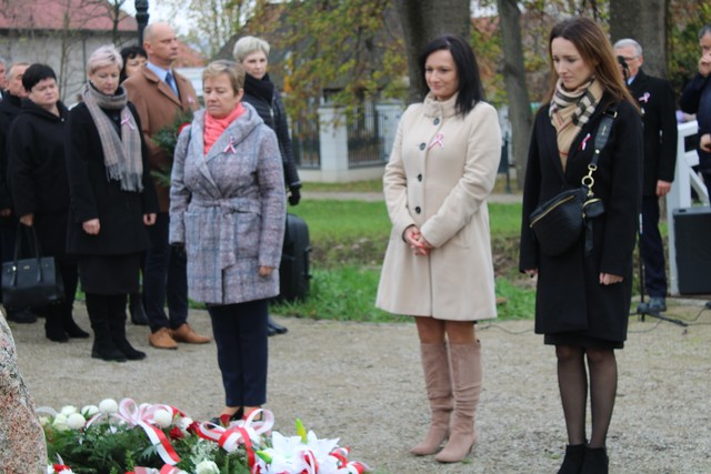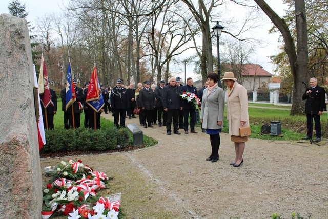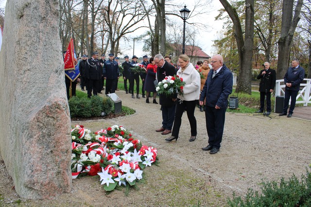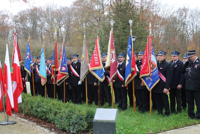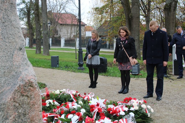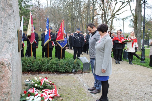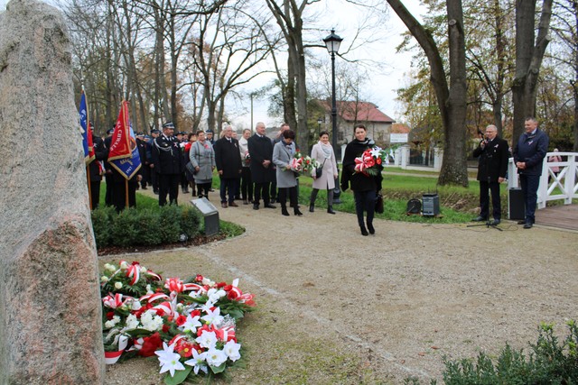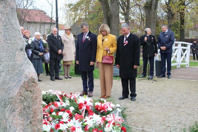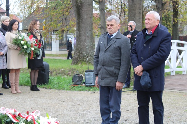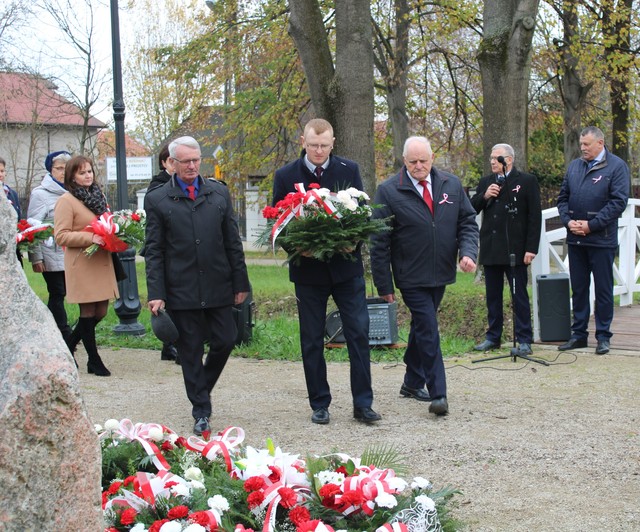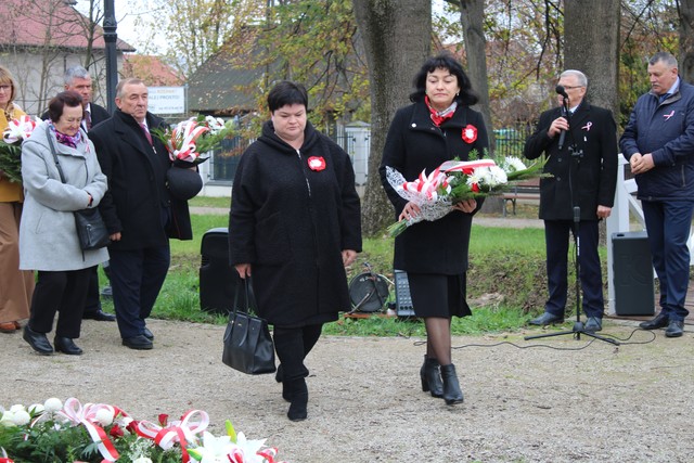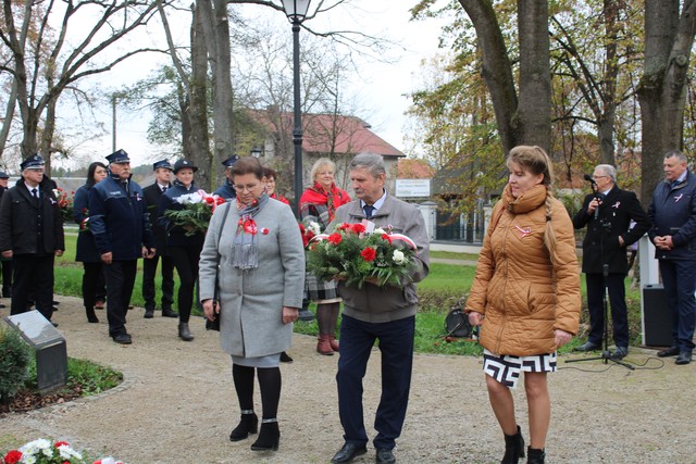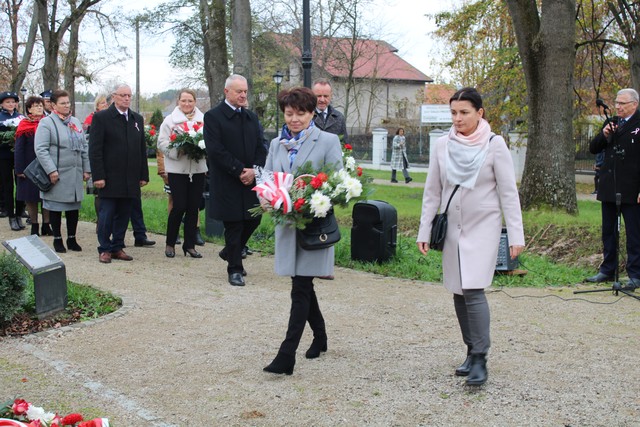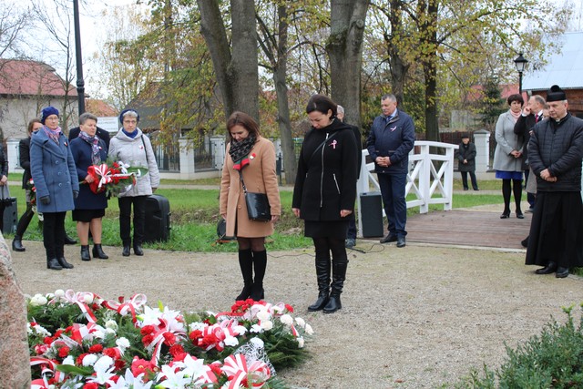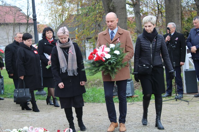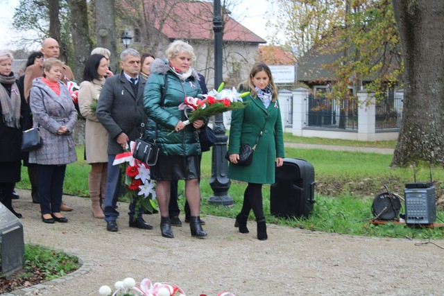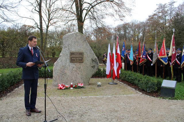 Dalsze obchody Święta Niepodległości odbyły się w parku „Dereniowy Skarb”, przy kamieniu upamiętniającym 100 –lecie odzyskania niepodległości. Wójt Gminy Krzysztof Woźniak w swoim wystąpieniu nawiązał do ważnych historycznych wydarzeń i postaci, które przyczyniły się do odzyskania przez naszą Ojczyznę niepodległości: „11 listopada przywołujemy tych, którzy byli architektami tamtej niepodległości: Józefa Piłsudskiego, Romana Dmowskiego, Ignacego Paderewskigo, Wincentego Witosa, Ignacego Daszyńskiego czy Wojciecha Korfantego. Wspominamy nazwiska wielkich wodzów formacji zbrojnych, które podjęły żołnierski marsz ku Niepodległej. W ślad za nimi szły tysiące żołnierzy, wielu ochotników świadomych tego, że to z ich trudu, z ich walki może powstać na nowo niepodległa Polska…To dzięki nim powstała II Rzeczpospolita, która stanowiła jedno z większych państw międzywojennej Europy”. Wójt podziękował za udział w Gminnych Obchodach Narodowego Święta Niepodległości oraz za wszelką pomoc w ich organizacji : „Bardzo dziękuję za udział w dzisiejszej uroczystości szczególnie naszym Gościom, delegacjom jednostek organizacyjnych Gminy Zadzim i delegacjom sołectw, jednostek Ochotniczych Straży Pożarnych, orkiestrze dętej OSP w Zadzimu, Kołom Gospodyń Wiejskich, przedstawicielom instytucji, zakładów pracy i działalności gospodarczych, stowarzyszeniom, wszystkich przybyłym mieszkańcom naszej gminy.Za przygotowanie Święta serdecznie dziękuję Szanownemu Ks. Proboszczowi parafii Zadzim, młodzieży i nauczycielom naszych szkół oraz pracownikom urzędu gminy.”