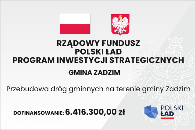 Jak już wcześniej informowaliśmy, samorząd nasz w roku bieżącym przystępuje do realizacji zadania pod nazwą „Przebudowa dróg gminnych na terenie gminy Zadzim”. Będzie to prawdziwa drogowa ofensywa, bowiem tylko w ramach tej jednej inwestycji zmodernizowanych zostanie aż 10 gminnych traktów. Realizacja tak dużego przedsięwzięcia możliwa jest dzięki pozyskanemu dofinansowaniu z Rządowego Programu Inwestycji Strategicznych „Polski Ład”– 2. edycja, w wysokości 6 416 300,00 zł, co stanowi 95% wartości kosztu robót.