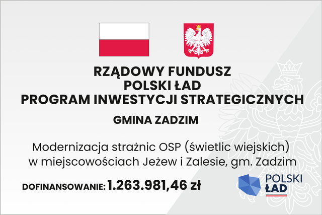 III edycja Rządowego Program Inwestycji Strategicznych POLSKI ŁAD skierowana była do gmin i powiatów, w których funkcjonowały tzw. PGR-y. Gmina nasza i w tym naborze złożyła stosowne wnioski, pozyskując środki finansowe na realizację zadania pod nazwą „Modernizacja strażnic OSP (świetlic wiejskich) w miejscowościach Jeżew i Zalesie, gm. Zadzim”.